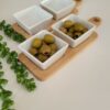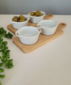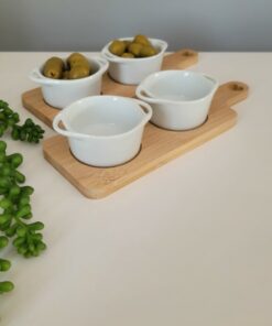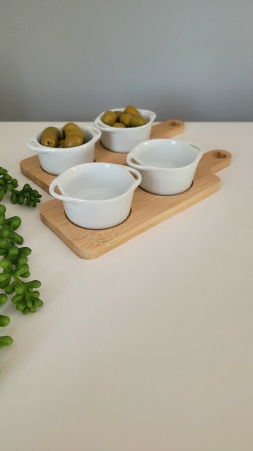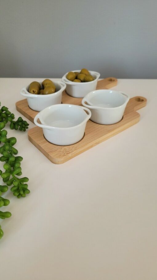 Set of 2 trays. Each have 2 porcelain dipping dishes set on a bamboo wooden tray. So beautiful!