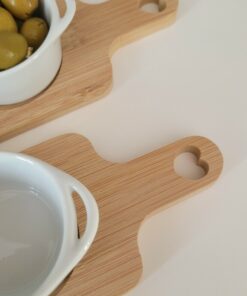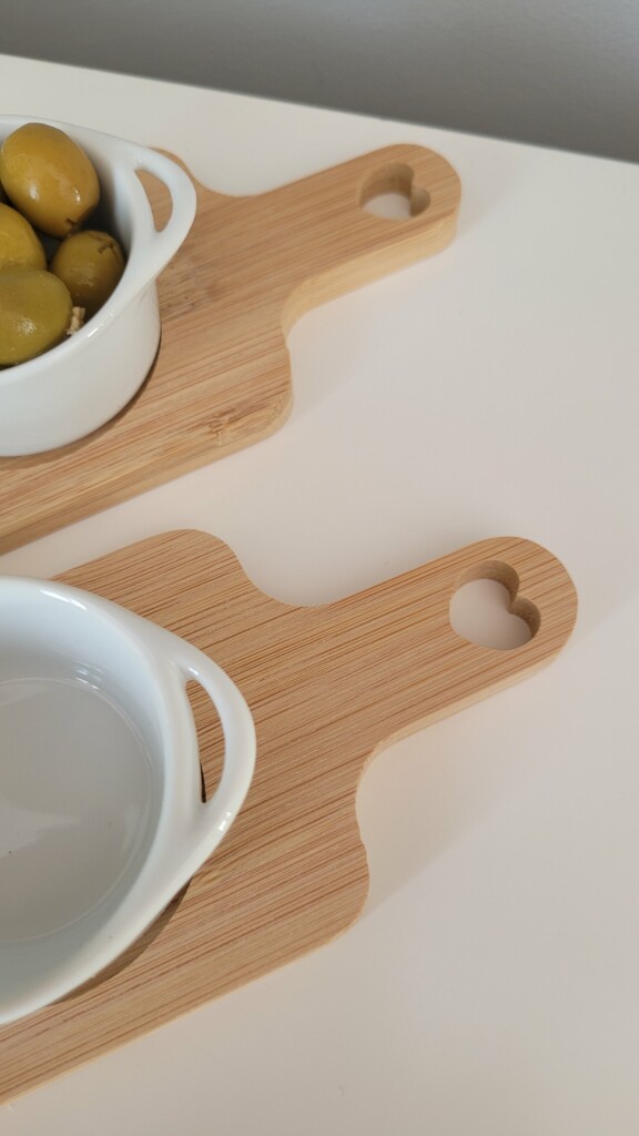 Each tray has a heart cut out on the handle and 2 porcelain circle dishes.