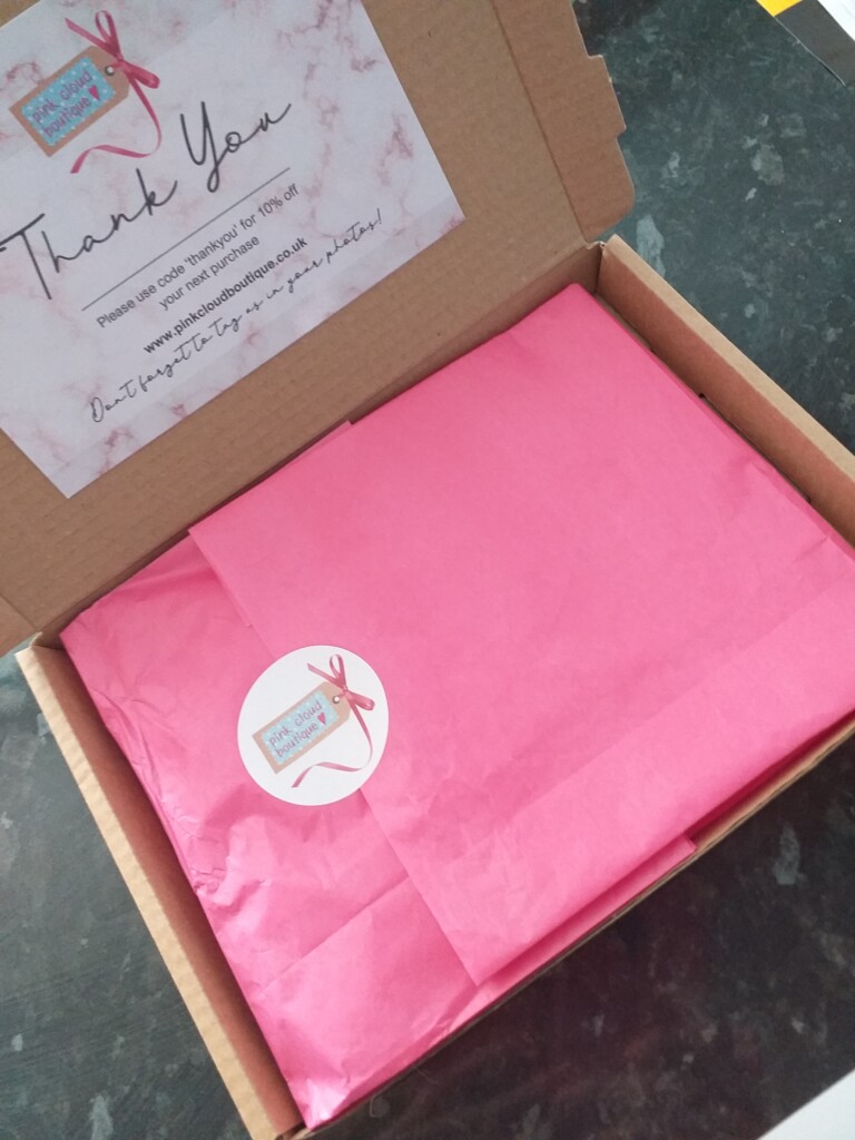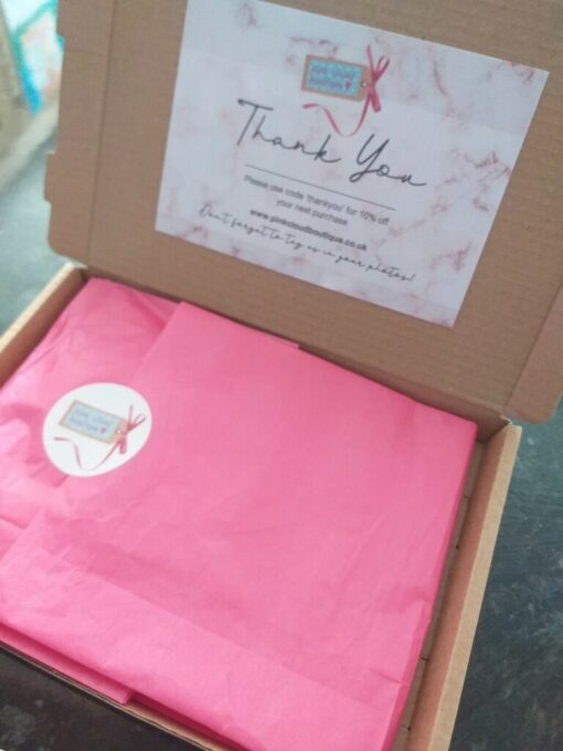 You will receive a cardboard box, pink tissue and shredded tissue.