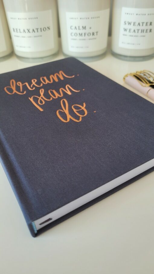Its a great idea to write down your goals and dreams so why not in our hand lettered Dream Plan Do, Navy/Grey and Rose Gold Fabric A5 Journal!