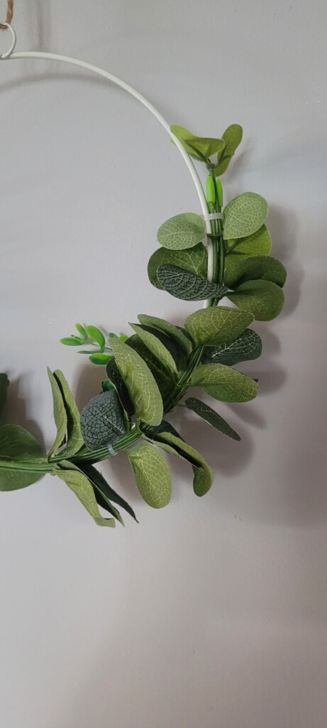 A beautifully simple half built wreath with delicate entwined artificial Eucalyptus leaves