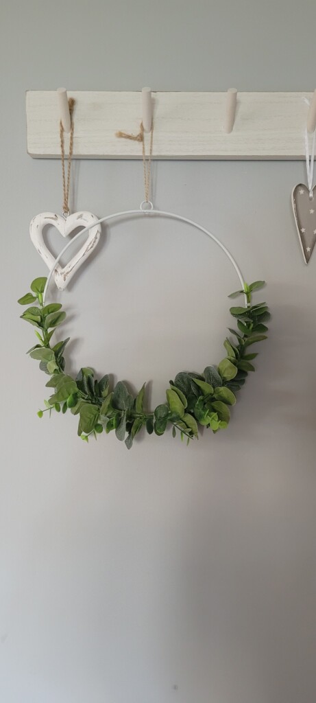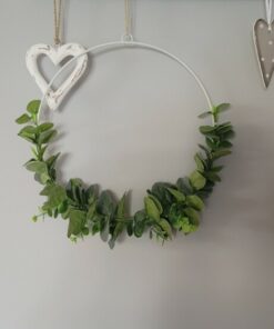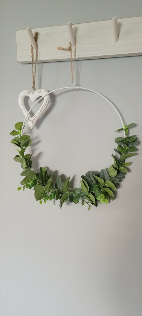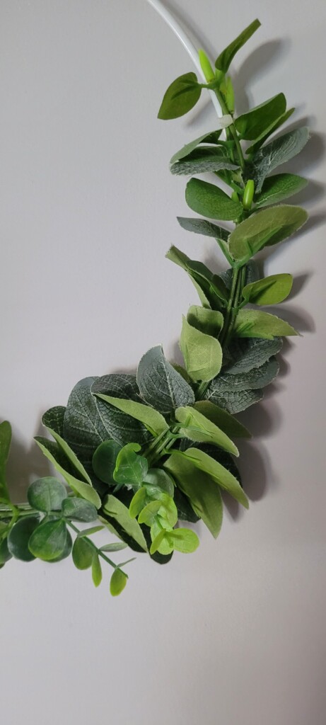 A beautifully simple half built wreath with delicate entwined artificial Eucalyptus leaves
