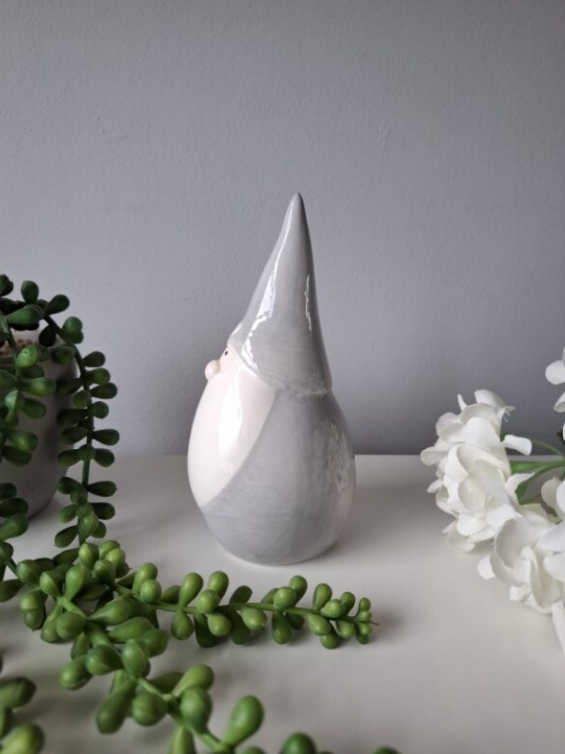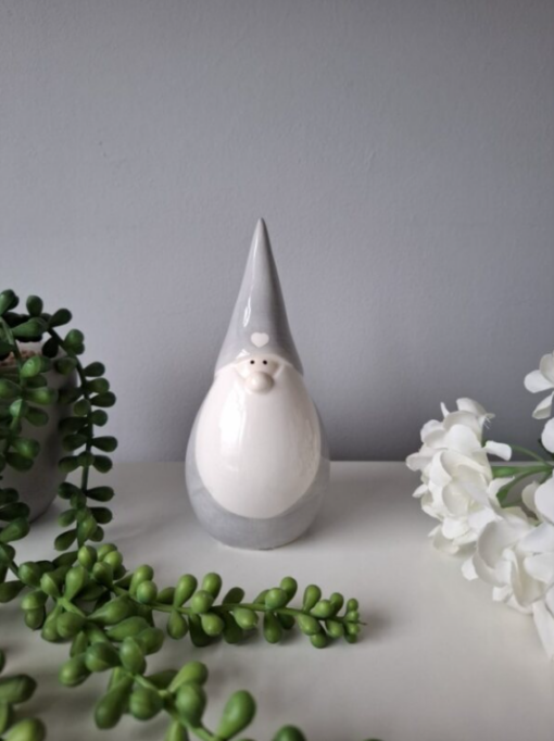 A fun and festive themed plump shaped ceramic gonk with grey colours and a sweetheart decal