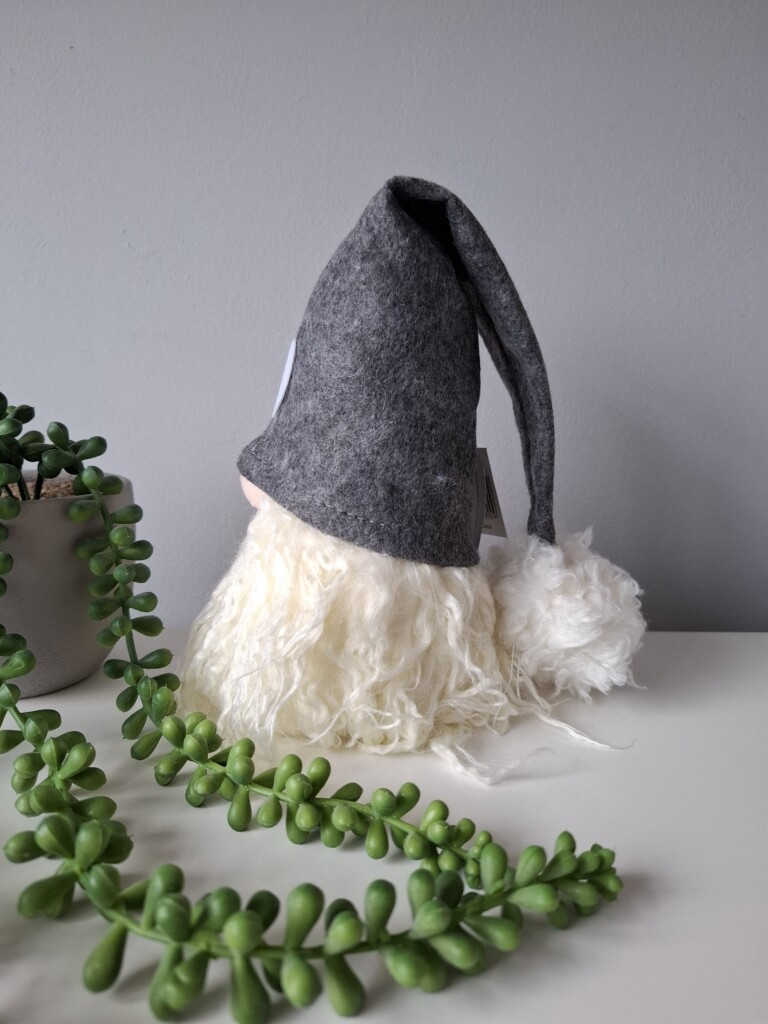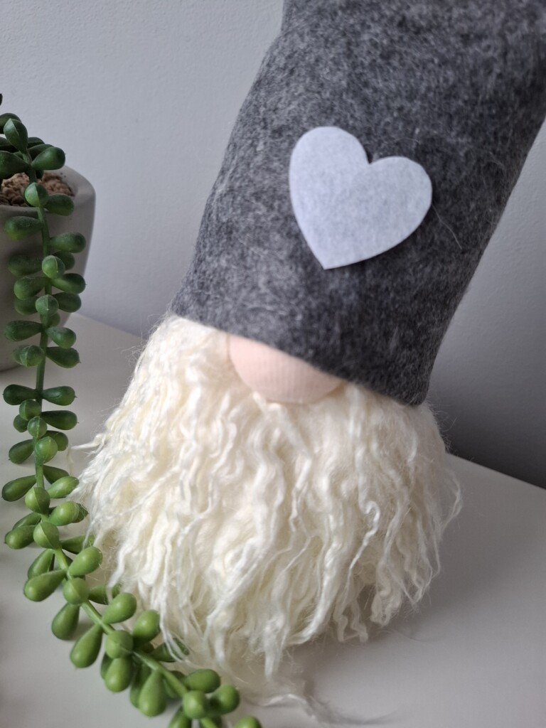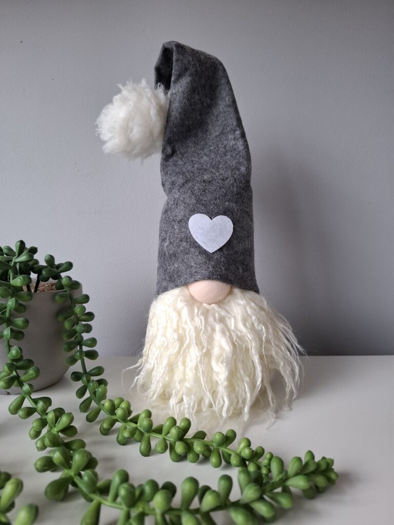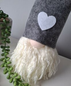 A grey and white gonk white with a fuzzy beard and a grey felt hat with a white heart.