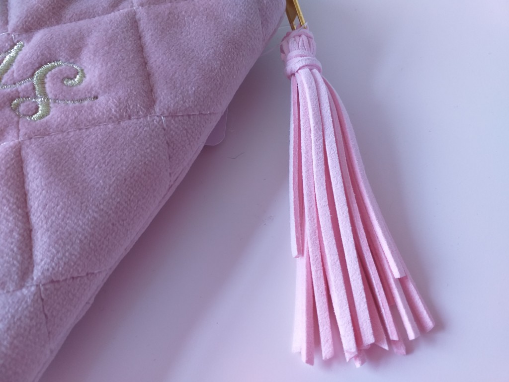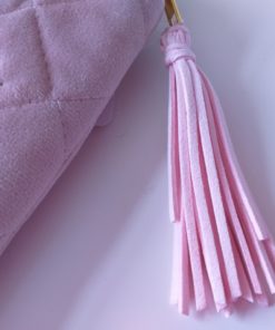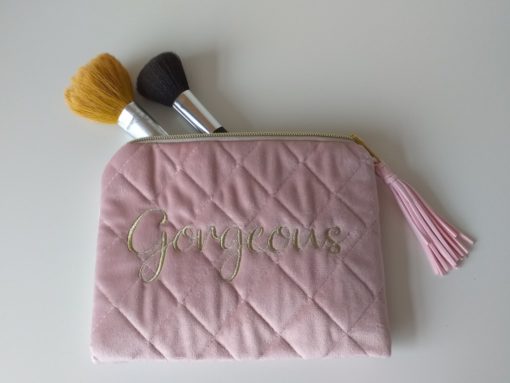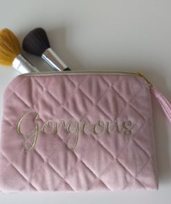 Pink velvet quilted make up bag. This super soft velvet make up bag has gold embroidery saying ‘Gorgeous’ on the front. The back is plain pink quilted velvet.