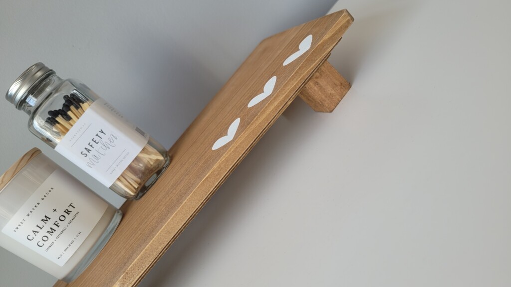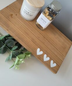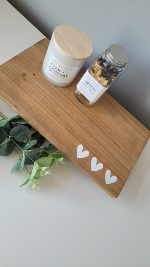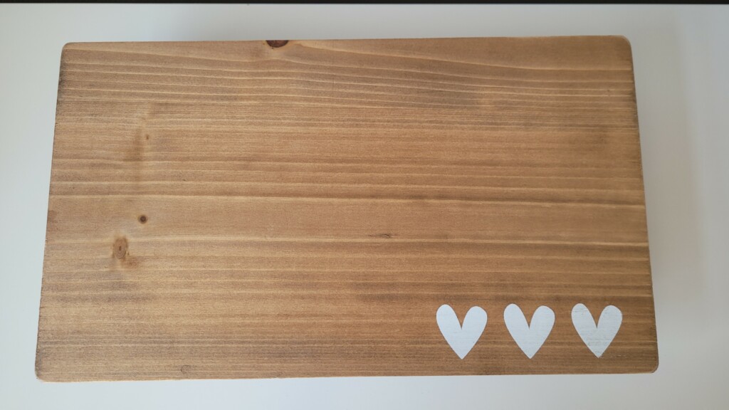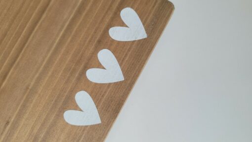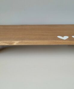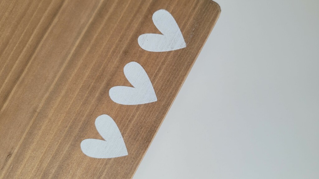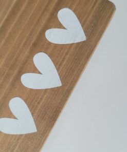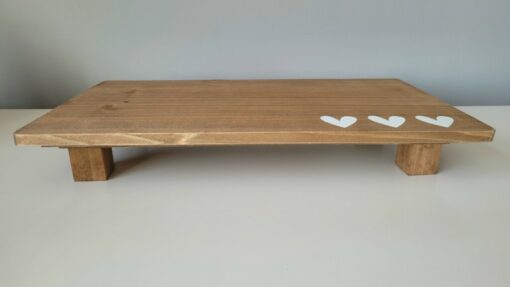 It has chunky wooden legs/feet and three white painted hearts in the right hand corner. Simple and beautiful.