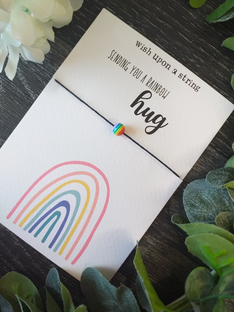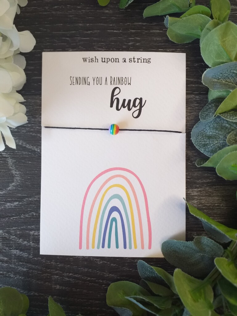 Sending you a rainbow hug wish string. What a wonderful idea! A small gift with the following words on the card.