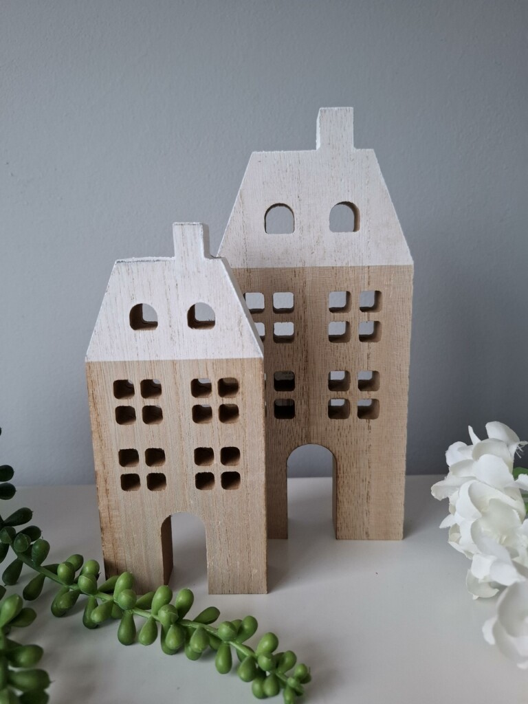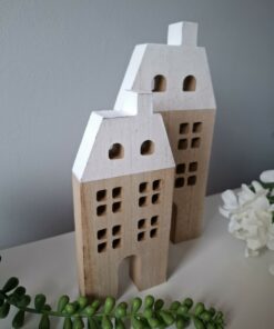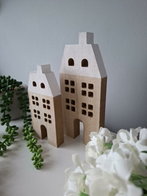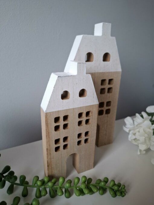 Embrace the cosy charm of Scandi style with this cute set of 2 wooden houses. Approx. height of the biggest house is 15cm.