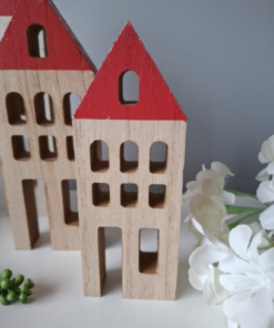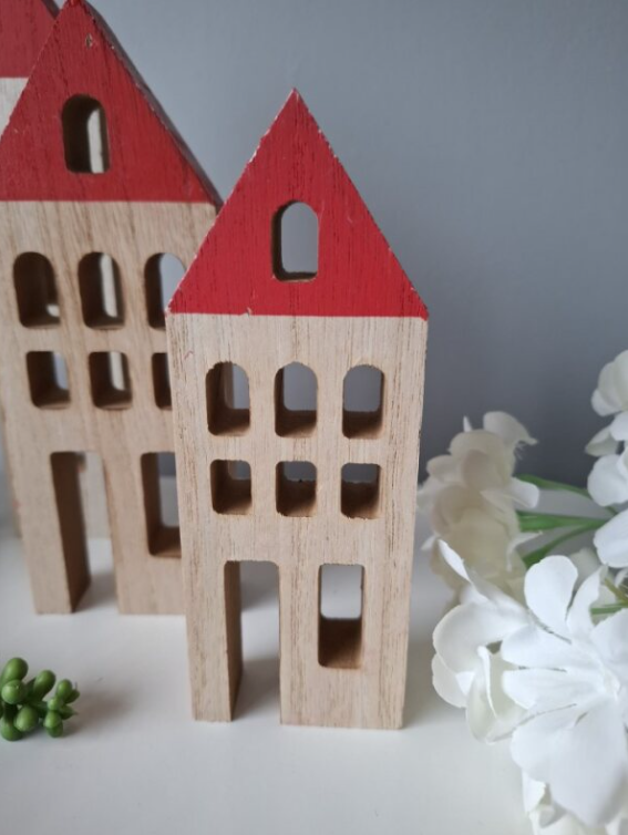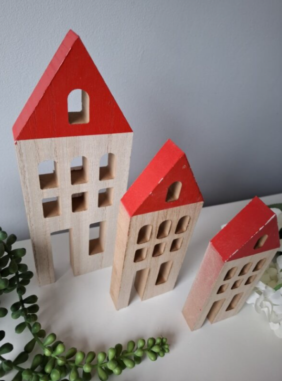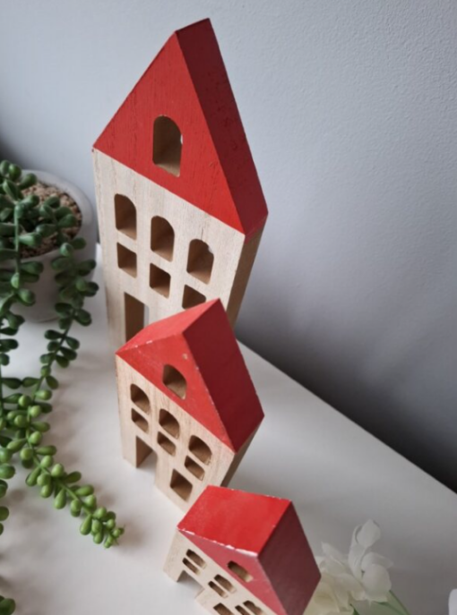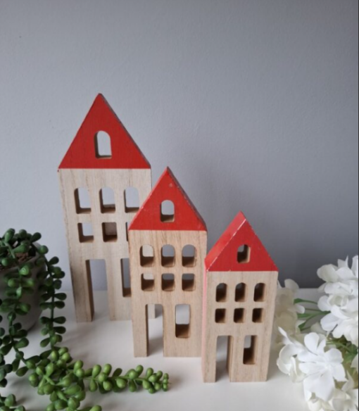 Embrace the cozy charm of Scandi style with this cute set of 3 wooden houses. Approx. heights of the houses are 23cm, 18cm & 15cm.