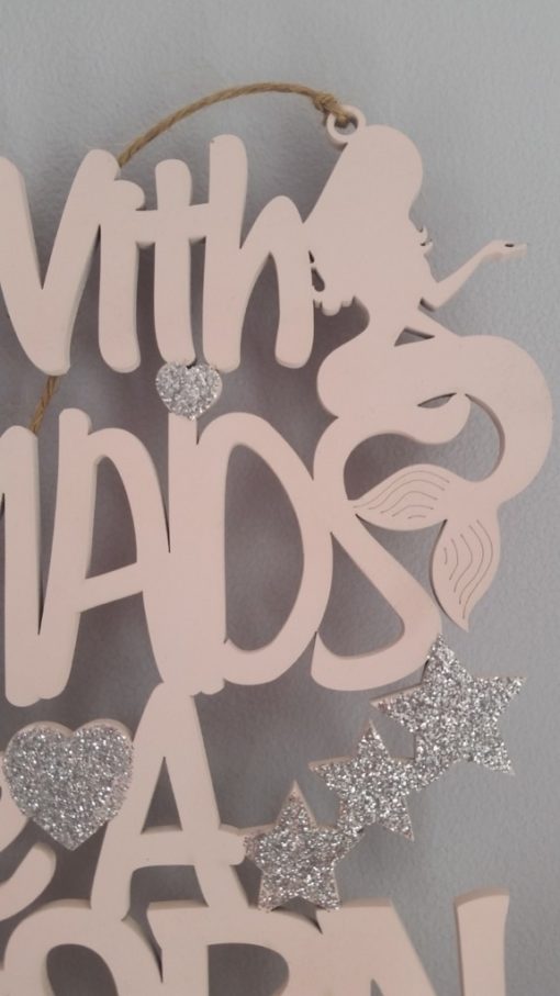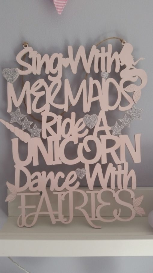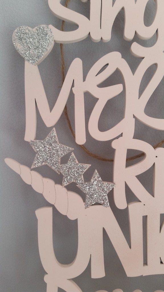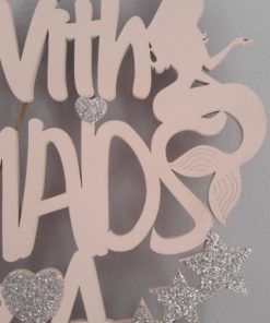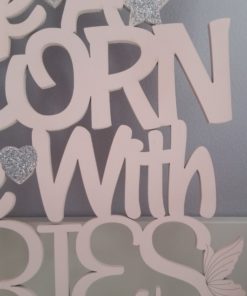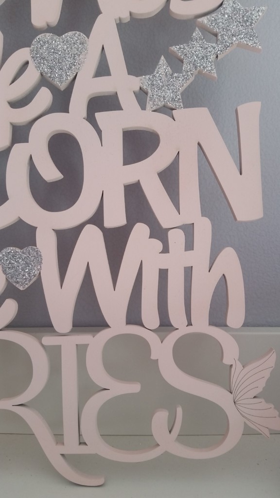 Beautiful laser cut MDF plaque. Painted with pale pink chalk paint with accents of silver glitter.