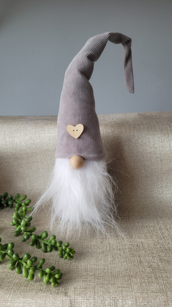 With a grey cord hat and cute heart button this little guy will look perfect in your home.