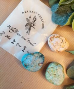 Recycled paper, wildflower seeds, natural plant dye, dried flower petals, dried lavender. Each seed bomb is 3cm wide and they come in a biodegradable glassine envelope.