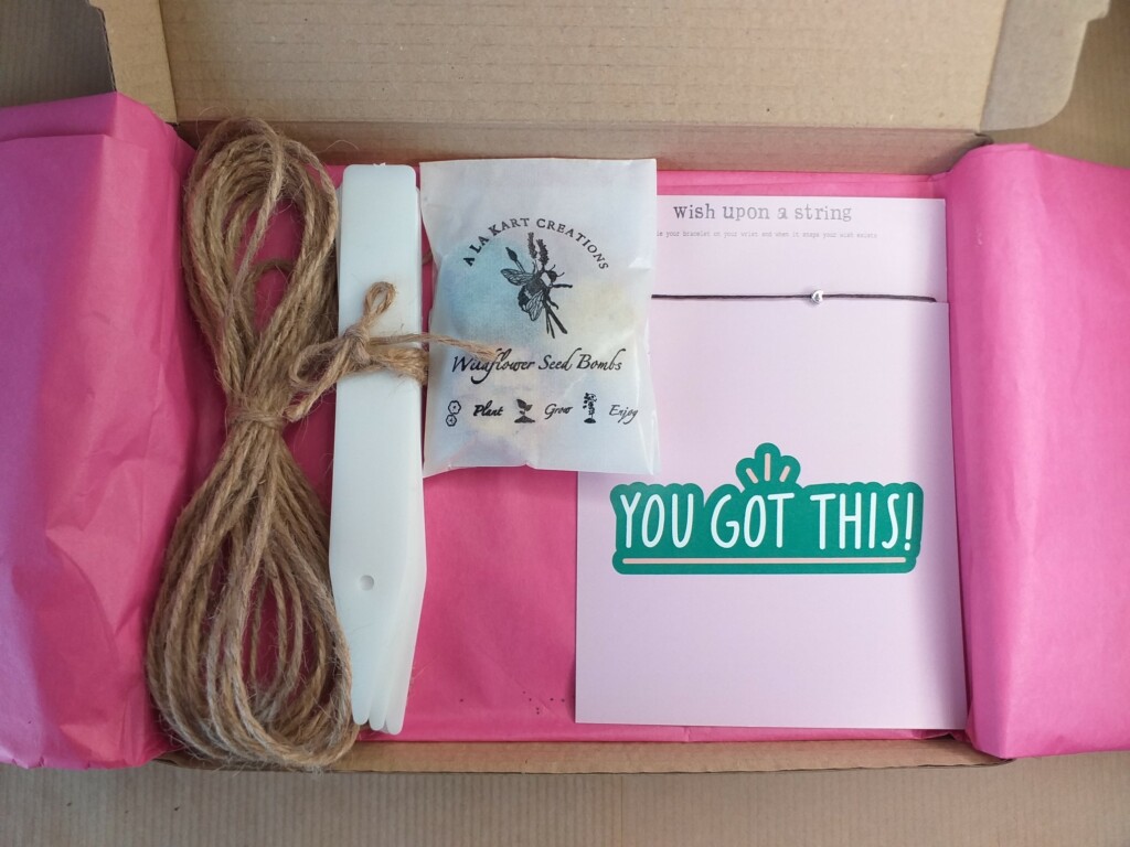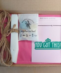 Please select which wish string or pocket hug you would like in the box. There are 14 to choose from!