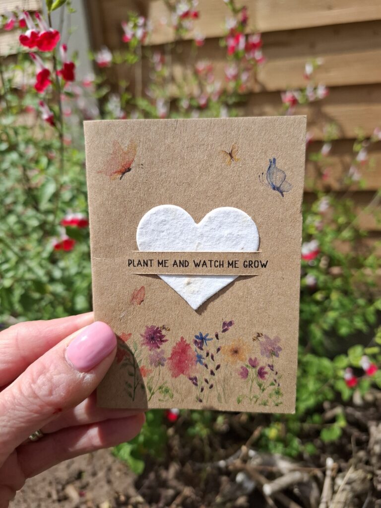 The seed paper heart is on a small brown paper card with a Wildflower and butterfies design and leaving it blank inside.