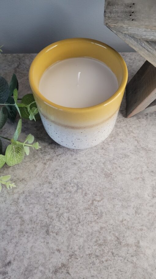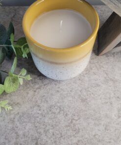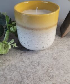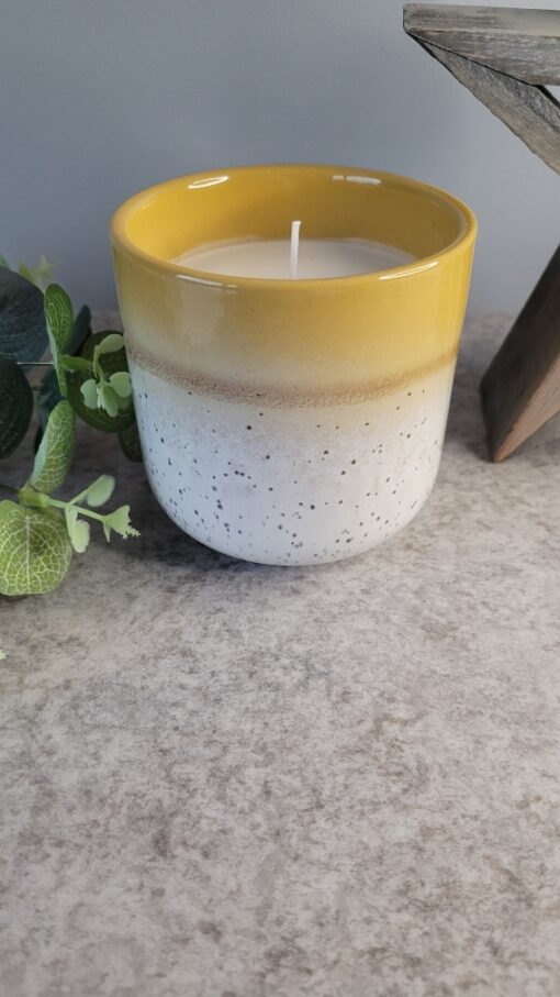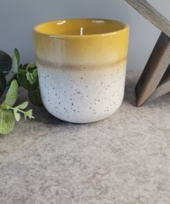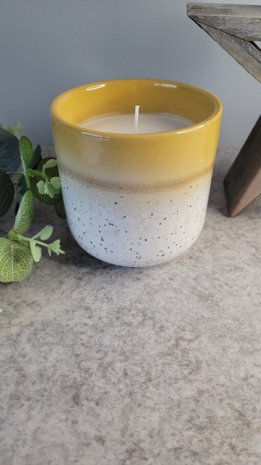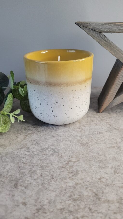 Set with a two tone speckled look, this porcelain candle has a sweetly scented wax centre and on trend colour tone with a light mustard top, soft brown/grey line, grey/white bottom with grey specks. Will be a lovely hint of colour to a living area or bedroom.