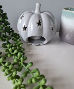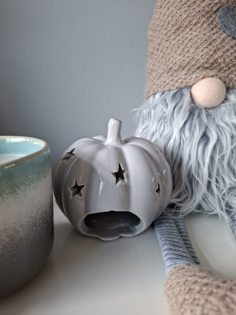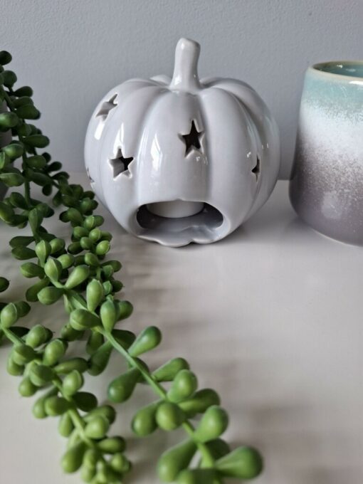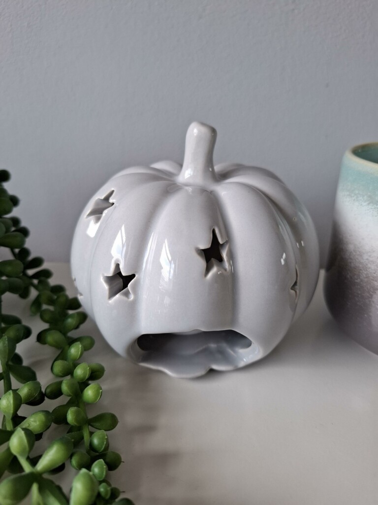 A simply stunning t-light holder in a grey pumpkin design, complete with cut out star decal. Perfect for adding a warm glow this spooky season.