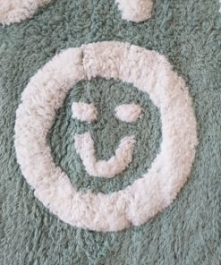 It is a green/blue colour, reminds me of duck egg blue with white writing and a smiley face.