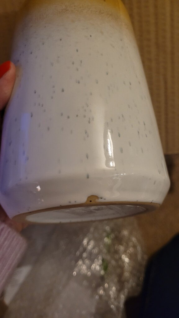 The vase is imperfect and as you can see in the photo, there is an imperfection in the ceramic at the base. The vase is still completely usable and fine if you place the vase against a wall you wont see it.