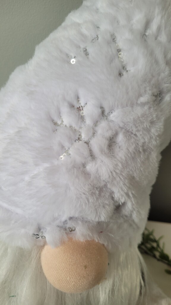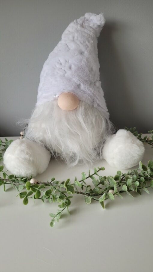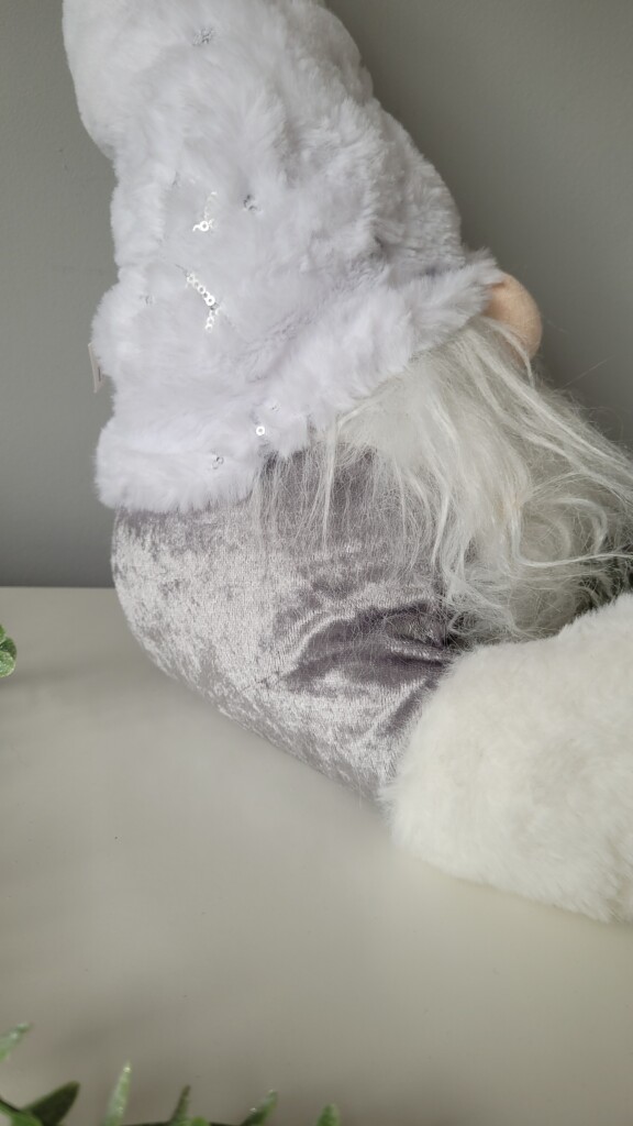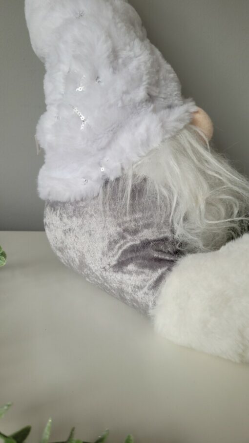 This luxurious gonk has a grey/silver velvet body, white fluffy beard and a gorgeously soft white hat with silver sequin snowflakes sewn on.
