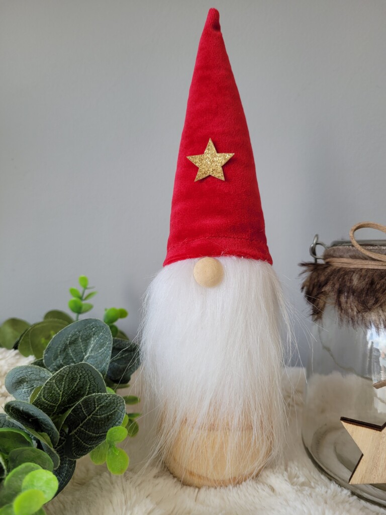 He has a natural wooden body, white fluffy beard, a little wooden nose and his red velvet hat has a gold glittery star attached. Simply gorgeous.