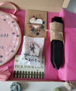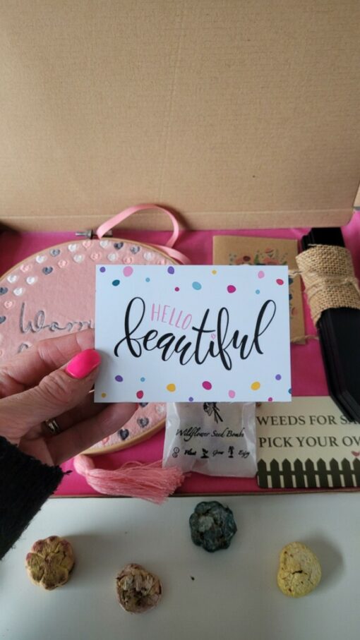 Wrapped in pink tissue and I always add a ‘Hello Beautiful’ card to the top.