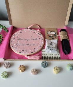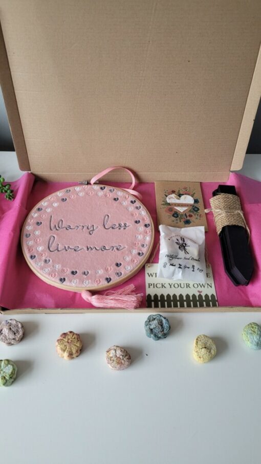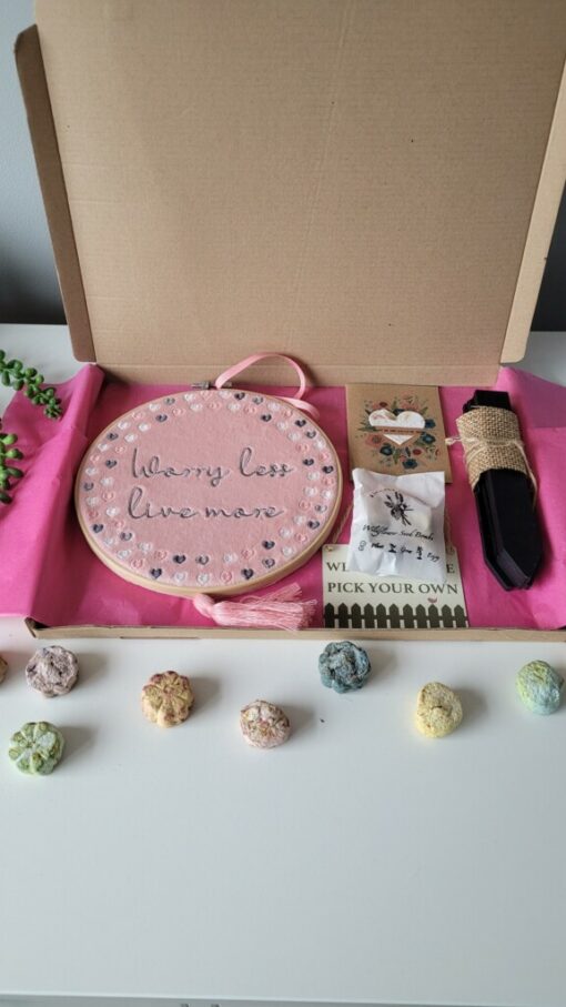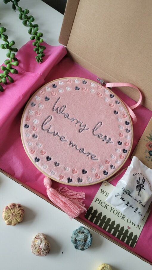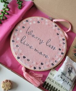 A hanging plaque with embroidered ‘Worry Less, Live More’ hoop.