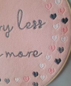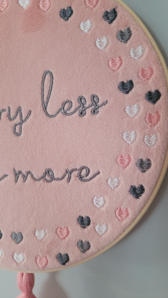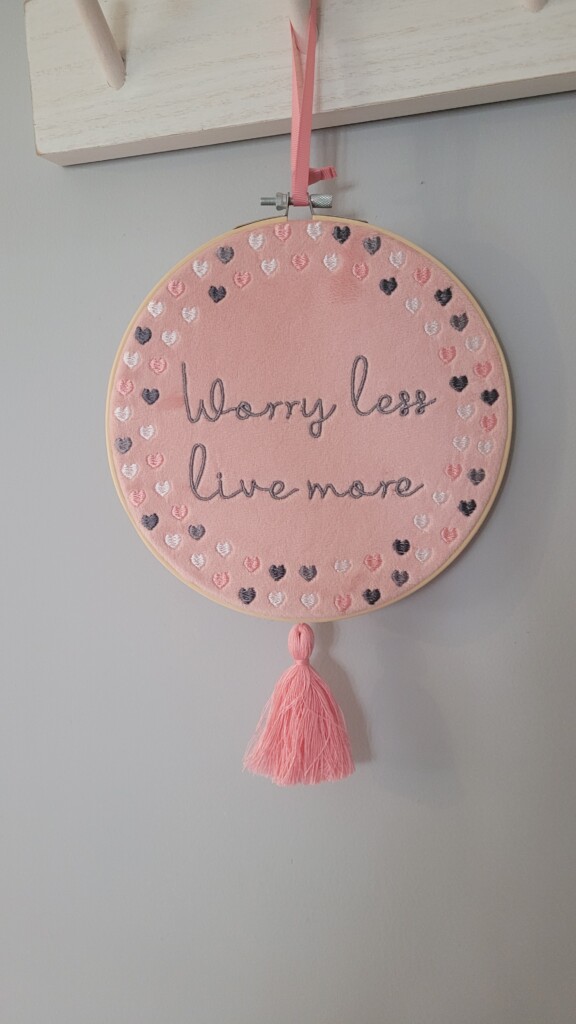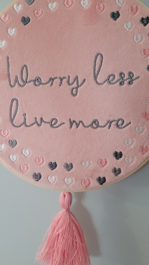 A beautiful pink velvet hoop with embroidered ‘Worry Less, Live More’.