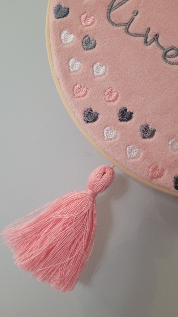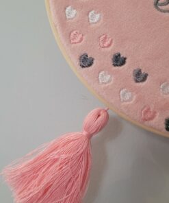 A wooden hoop with pink velvet fabric with grey, pink and white embroidered writing and hearts. Comes with a pink ribbon to hang and a pink tassel.